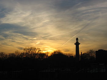 Washington Park, renamed Fort Greene Park in 1897, was established as Brooklyn’s first park in 1847 on a 30-acre (120,000 m2) plot around the site of the old Fort. In 1864, Frederick Law Olmsted and Calvert Vaux, by now famous for their design of Central Park, were contracted to design the park, and constructed what was described in 1884 as “one of the most central, delightful, and healthful places for recreation that any city can boast.” Olmsted and Vaux’s elegant design featured flowering chestnut trees along the periphery, open grassy spaces, walking paths, a vine-covered arbor facing a military salute ground, a permanent rostrum for speeches, and two lawns used for croquet and tennis. The park’s success prompted the creation of the larger Prospect Park. At the highest point of the park, The Prison Ship Martyrs Monument and vault was erected in 1908 to house the bones of some of the 12,000 Revolutionary soldiers and civilians whose bodies were thrown off British prison ships and later washed ashore. The monument, designed by the firm of McKim, Mead, and White, was the world’s largest Doric column at 143 feet (44 m) tall, and housed a bronze urn at its apex. Restoration work on the monument was completed in the late 2000s.